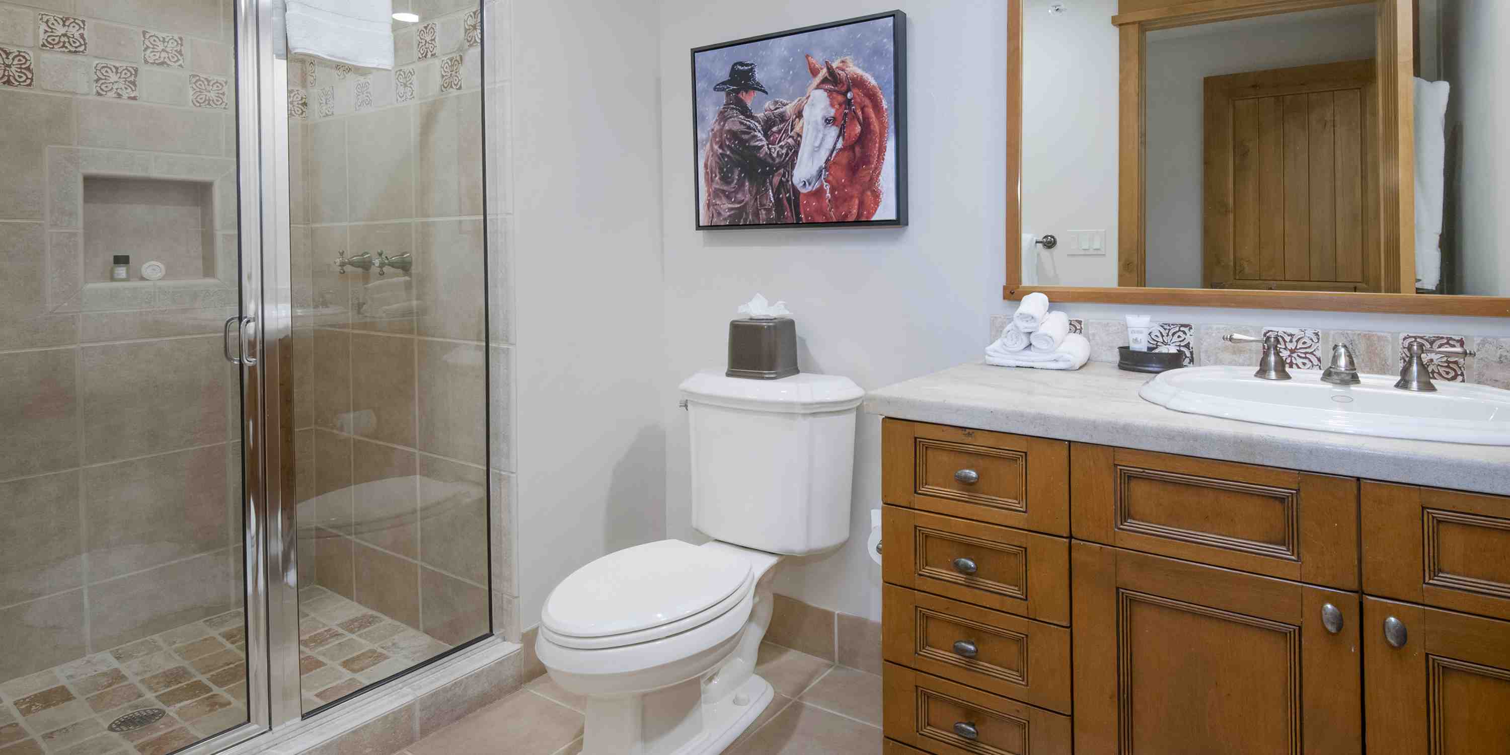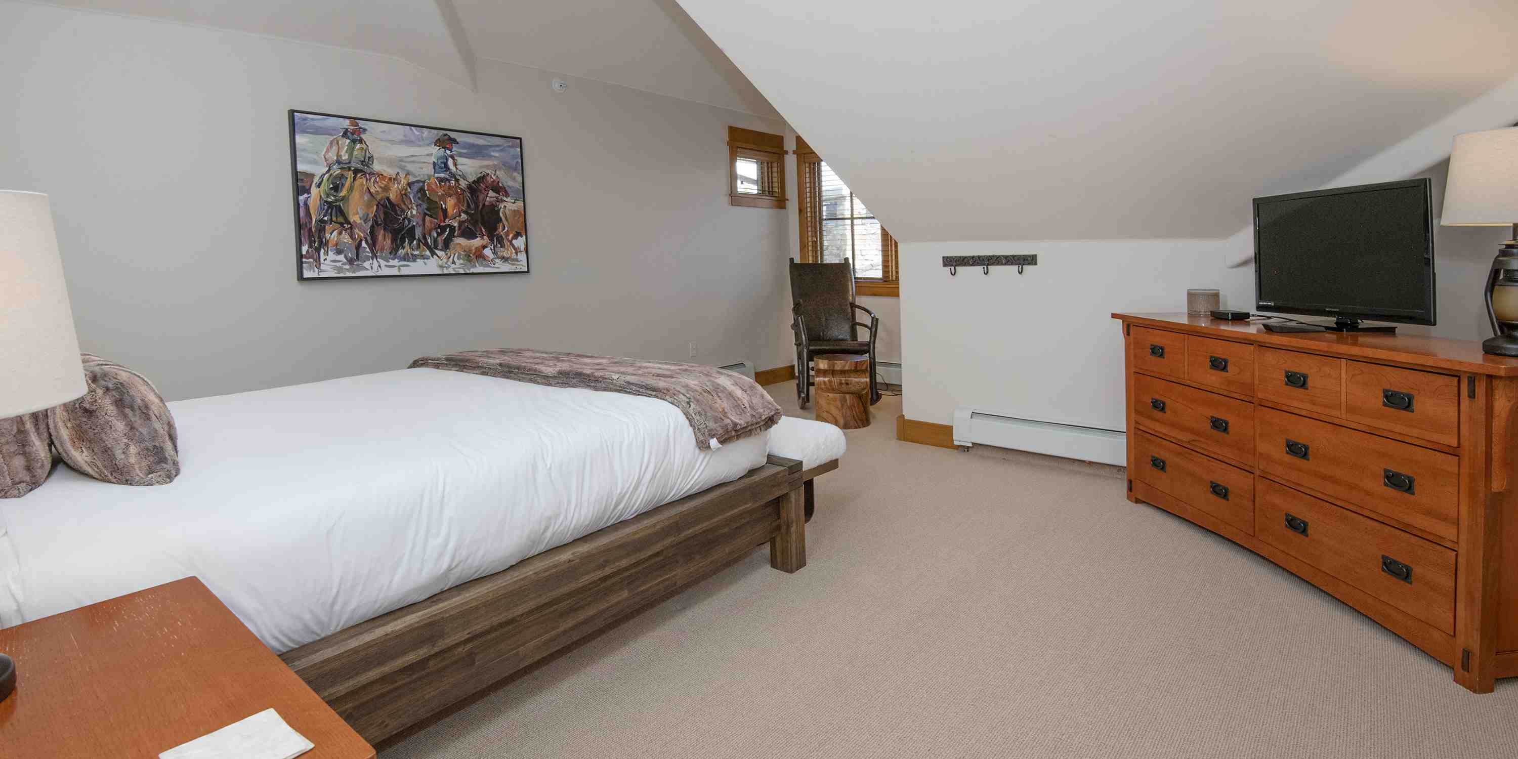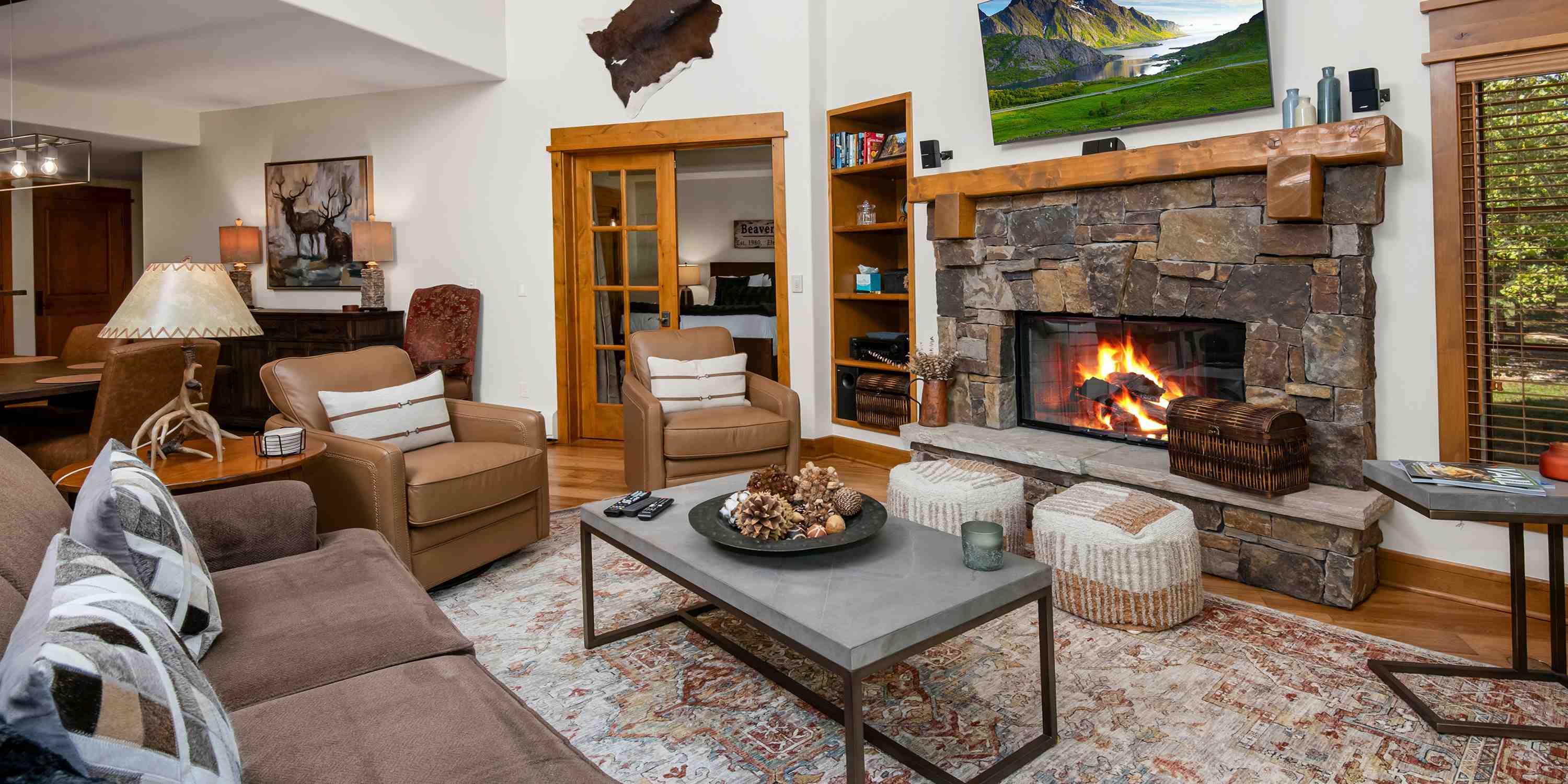 Once you get settled in here, you’re in for the ultimate experience. At Settler’s Lodge, the premiere accommodations in super-exclusive Bachelor Gulch, anything is possible, so don’t settle for less than everything! At Settlers Lodge #302 accessibility to recreation is at a premium and it’s coupled with a serenity and privacy unmatched. This exceptional mountainside condominium has ski-in/ski-out access and door-to-slope shuttle service. Rustically refined, it proudly presents fashionable furnishings reminiscent of an upscale grand mod country mountain chalet. Surrounded by nature, the inner decor reflects the natural authenticity of the great outdoors. This extraordinary property boasts vaulted ceilings, a granite stone hearth with large gas fireplace and an ample great room with floor to ceiling draped windows. Rooms adorned with antique cabinetry, quilted linens and floral printed area rugs. Spectacular views of the gathering Aspens of the Gore Mountain Range from the covered balcony. Spacious, light-filled and airy. There’s a gourmet kitchen stocked with all the modern amenities and appliances. Satellite TVs throughout. Why store your wet, cold gear in your rental? There are complimentary ski lockers with boot warmers on the first floor of the complex. Premium underground heated parking in a secure on site garage.